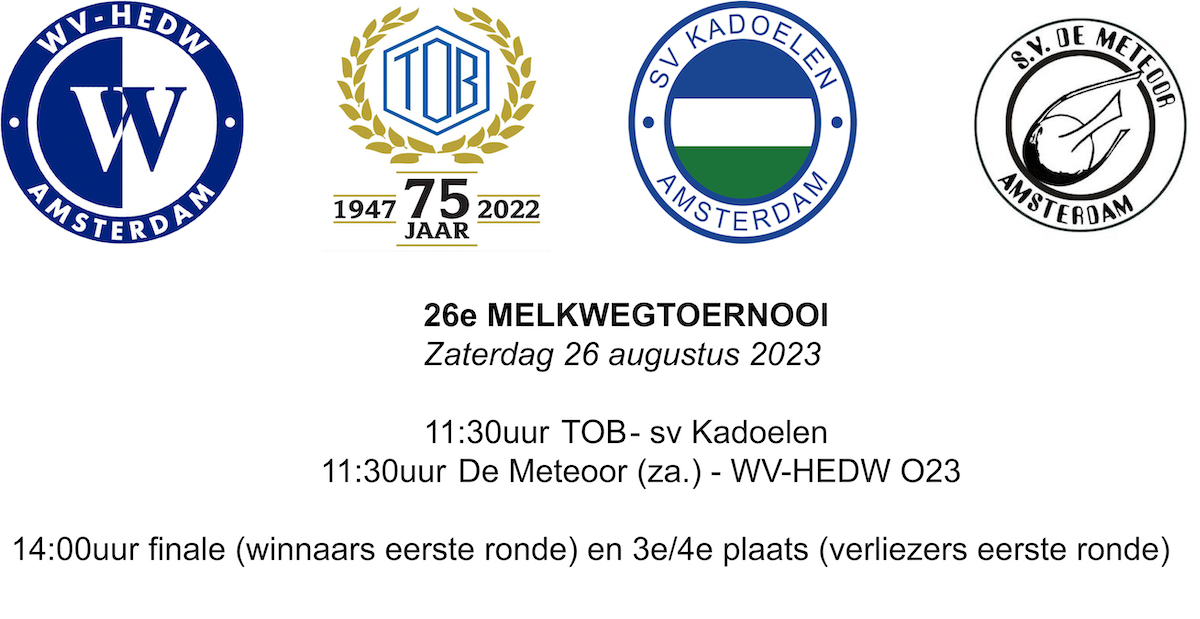 Op zaterdag 26 augustus zal voor de maar liefst 26e (!) keer het traditionele TOB Melkweg Toernooi worden georganiseerd! Deelnemers zijn dit jaar de sterke formaties van Kadoelen, De Meteoor, WVHEDW Onder 23 (van oud-TOB-speler én trainer Tim van Horn) en gastheer TOB.