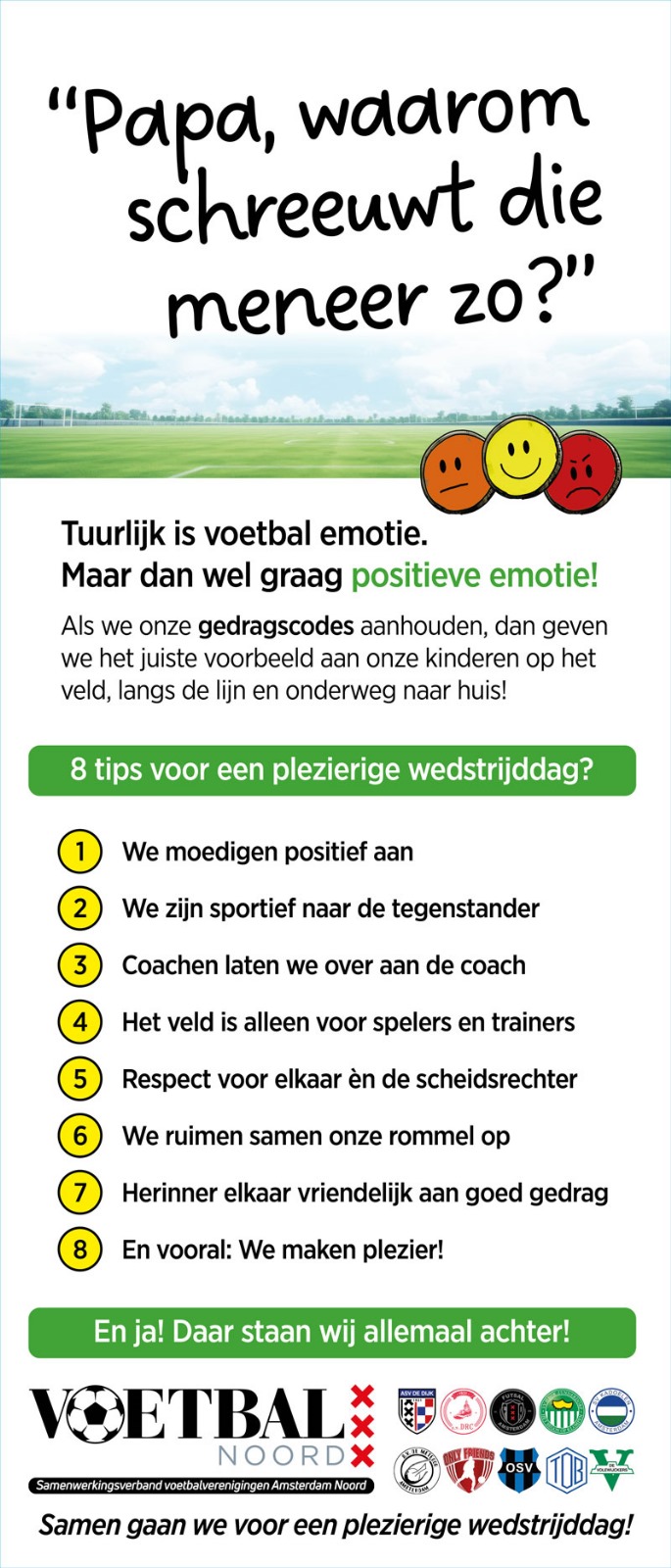 Met deze campagne gaan de 9 voetbalclubs in Amsterdam Noord, verenigd in Voetbal Noord, gezamenlijk aandacht besteden aan het tegengaan van ongewenst gedrag voor, tijdens en na de wedstrijden.